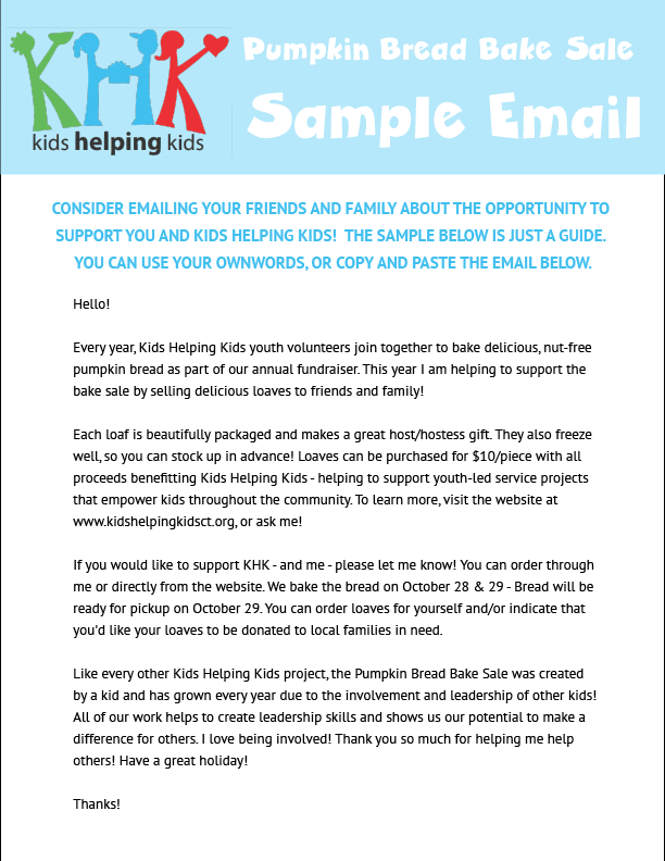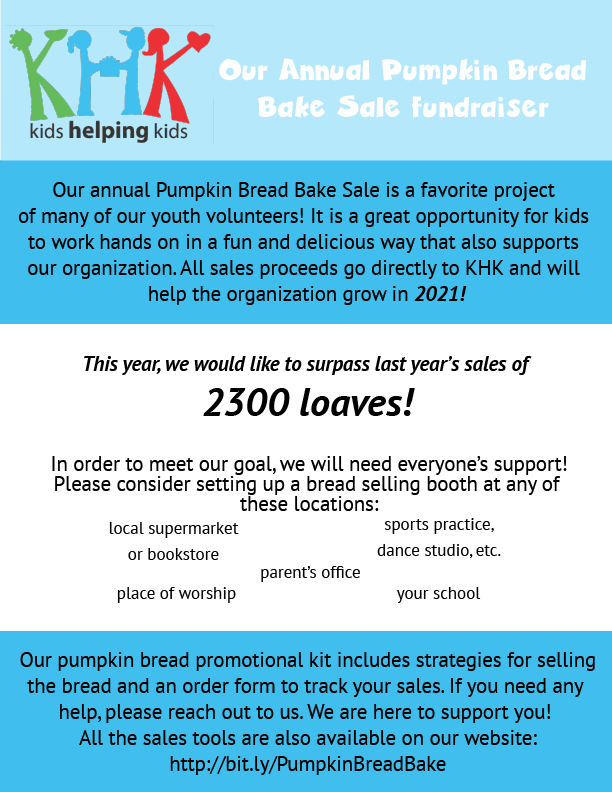 Kids Helping Kids (KHK) is a non-profit organization that I intern with in my hometown. KHK aims to inspire children to make a change through youth-led service projects to benefit the less fortunate children in the community. One of KHK’s only for-profit event is their annual pumpkin bread bake, in which volunteers bake the bread and sell it to the friends, family, etc. or donate it to shelters. This year, through my internship, I was responsible for redesigning the materials within the bread bake sales kit. These materials were distributed to our KHK community to share with others and promote the annual fundraiser.