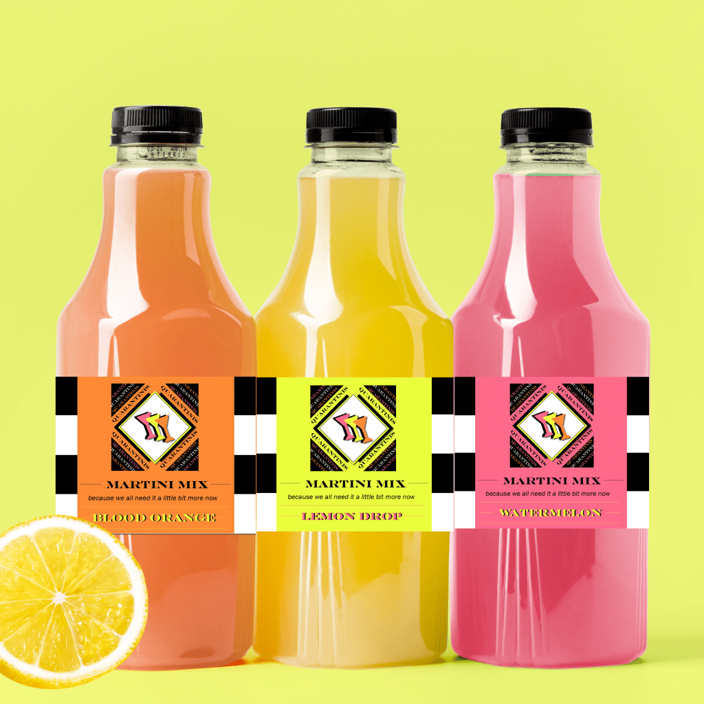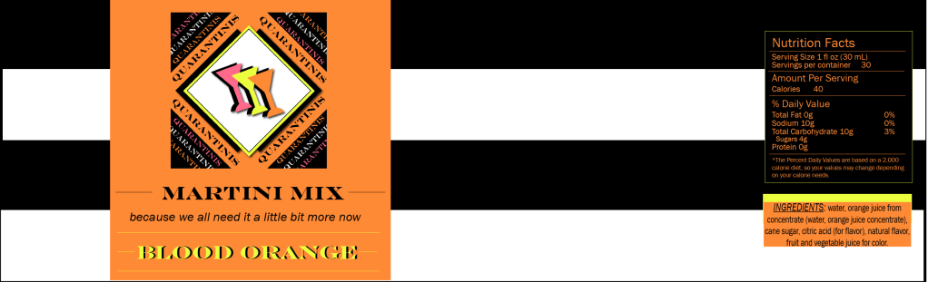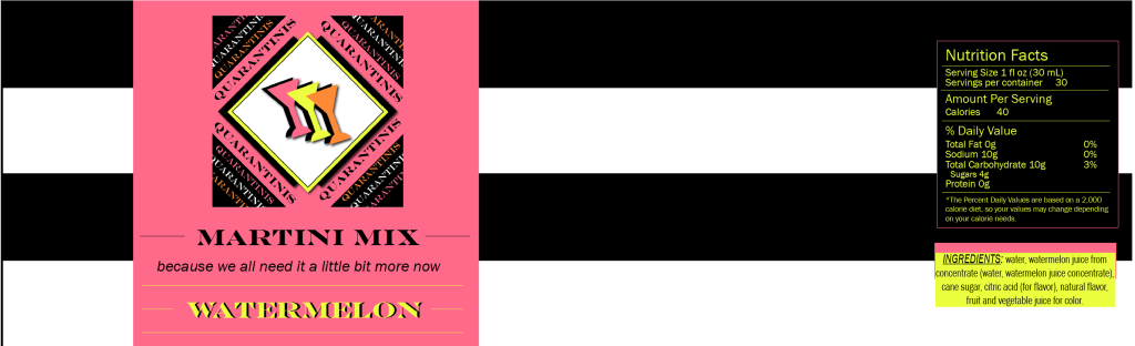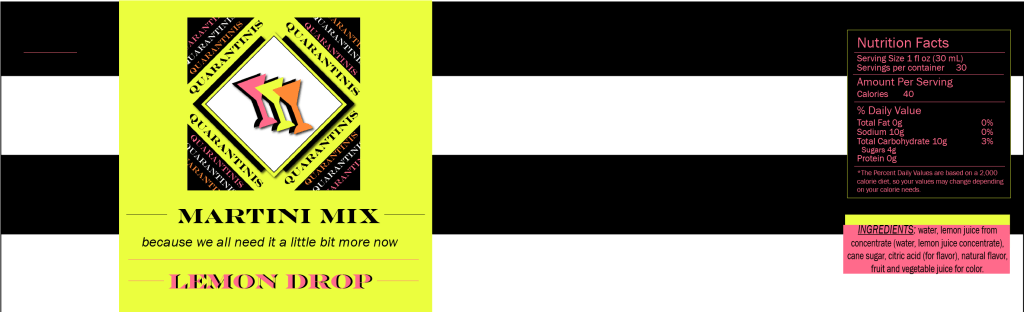 Quarantinis is a fictional martini mix company founded during the first COVID-19 quarantine period. The inspiration from this came from the increase in alcohol sales and adventurous cocktail making that many people took on during lockdown. Quarantinis currently come in flavors Blood Orange, Lemon Drop, and Watermelon.